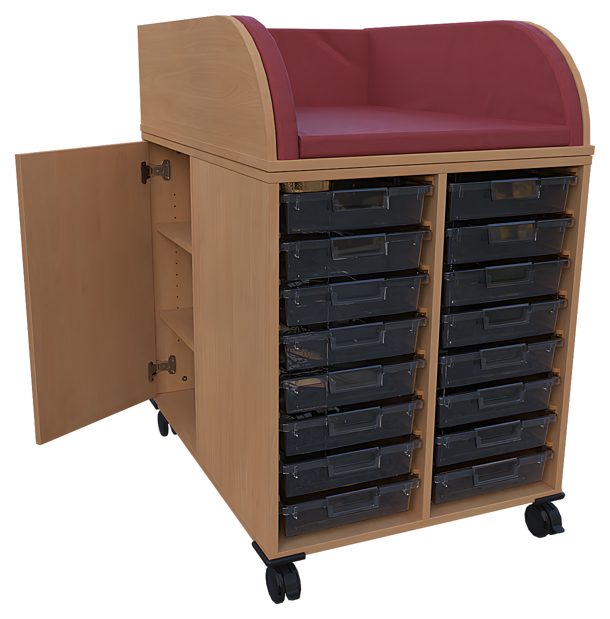 - vorne: offen, Mittelwand, 2 x 7 flache Kunststoffschübe