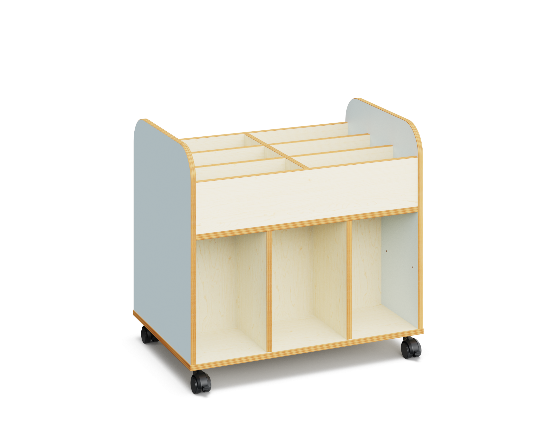 Bücherwagen zum Präsentieren und Lagern von Büchern, Spielen usw. Mit feststellbaren Rollen. Auch zum Trennen von verschiedenen Lernzonen geeignet.