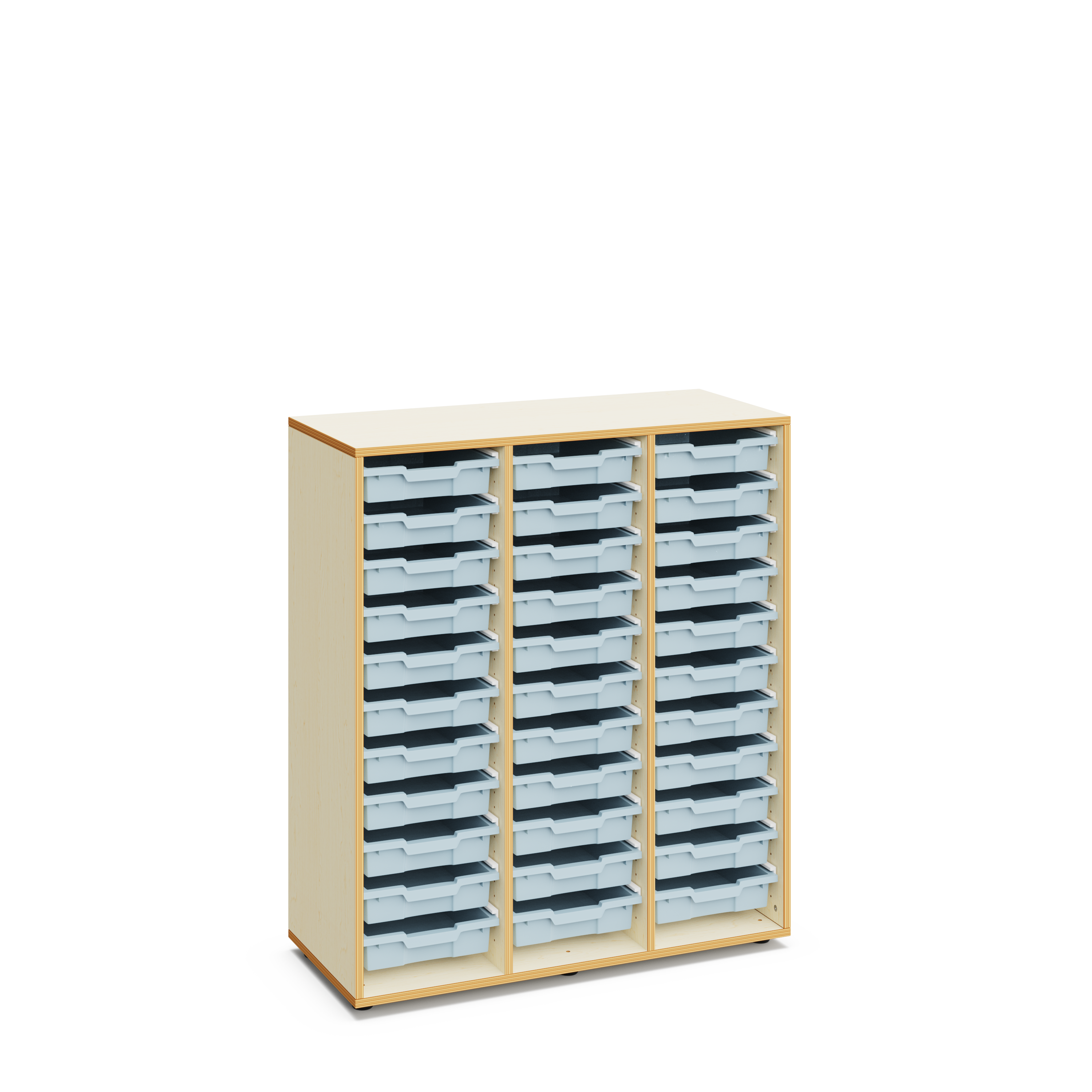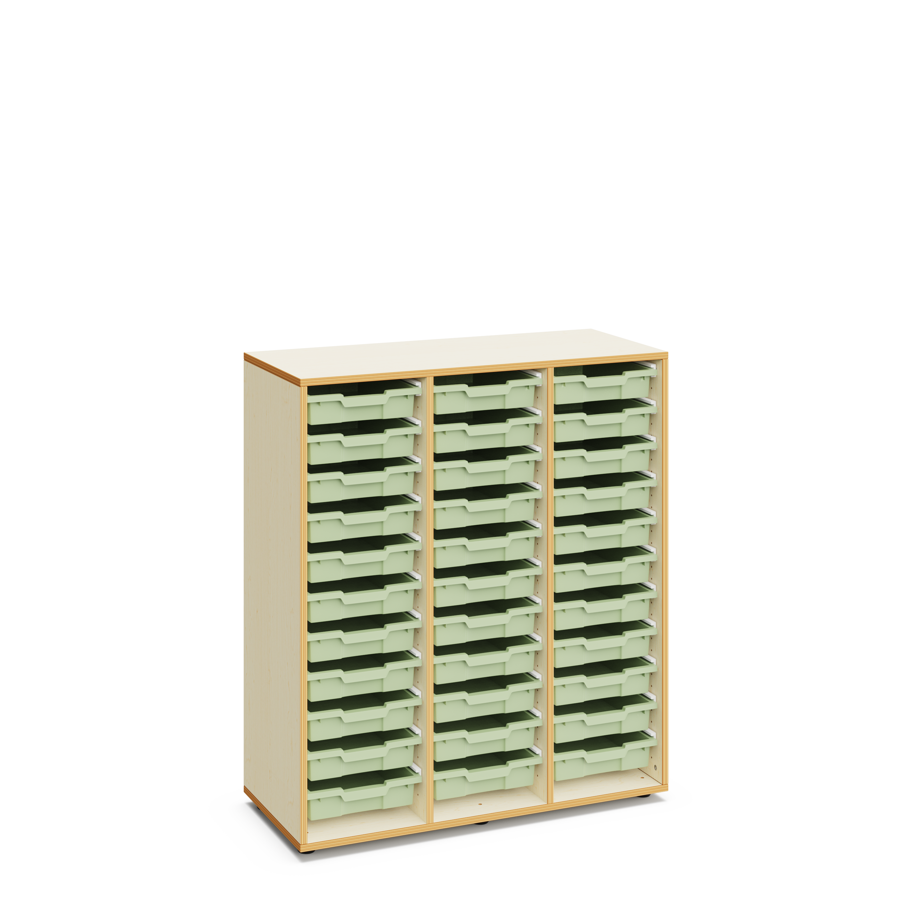 Materialcontainer aus Holz. 120 cm hoch mit 33 flachen Kunststoffboxen. Ideal als Klassenzimmerschrank und um Material zu lagern.
