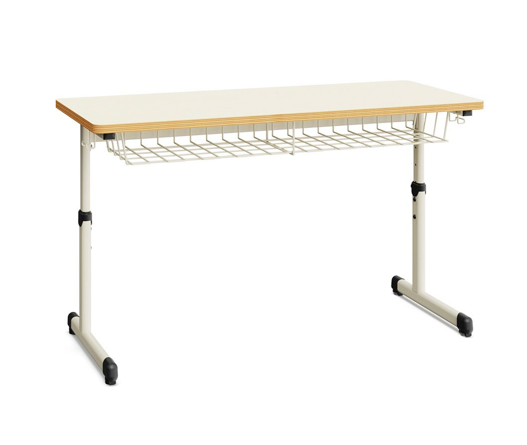 Schülertisch mit höhenverstellbarem L-/C-Gestell und Mappenhaken. Drahtkorbablage und Filzgleiter sind optional möglich. Den Einertisch Quar finden Sie hier.